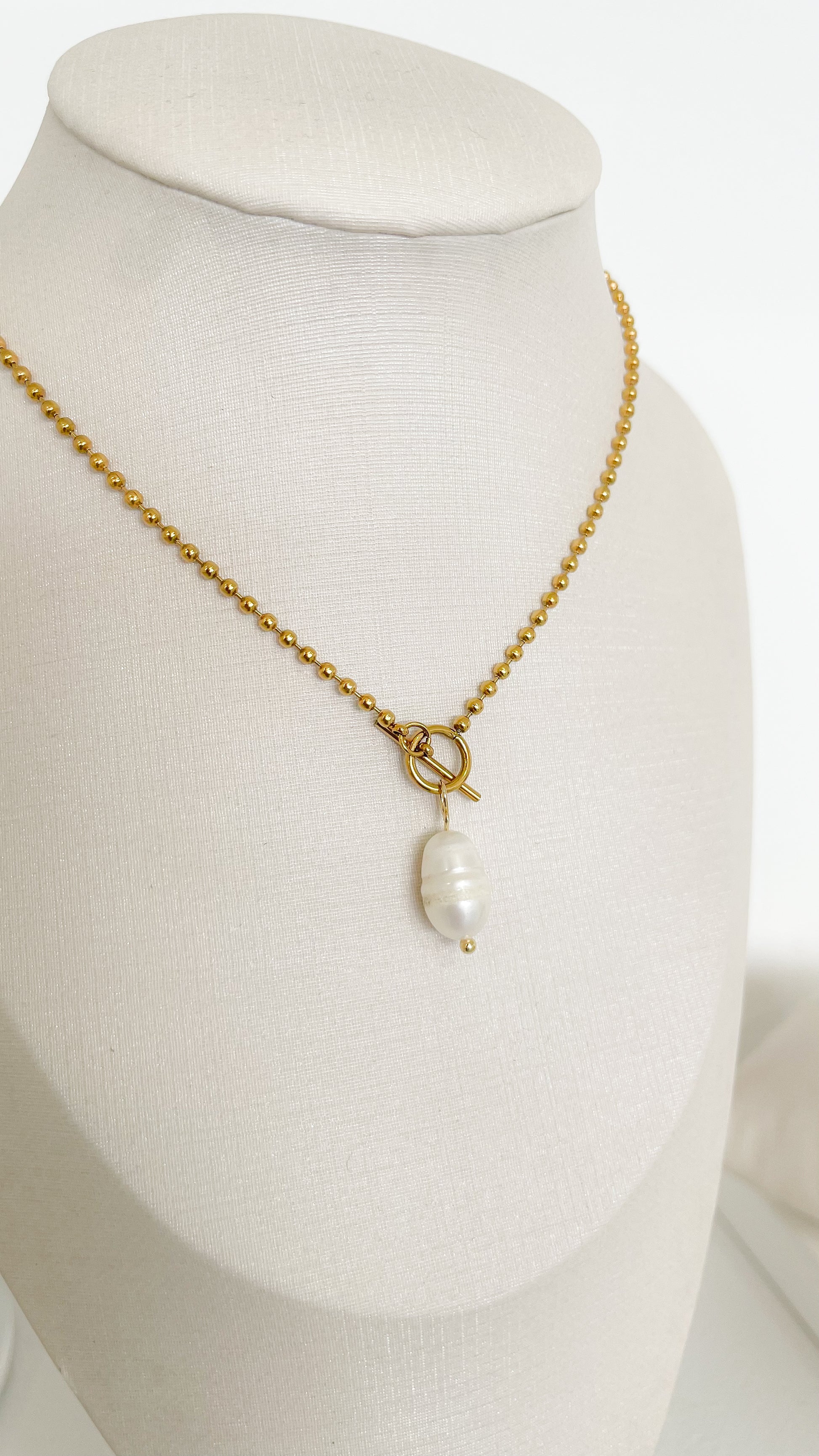 - Collar de acero inoxidable tejido tipo Marinero, dije de perla y balin